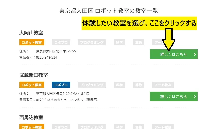 一覧から体験したい教室を選び、「詳しくはこちら」をクリックする。