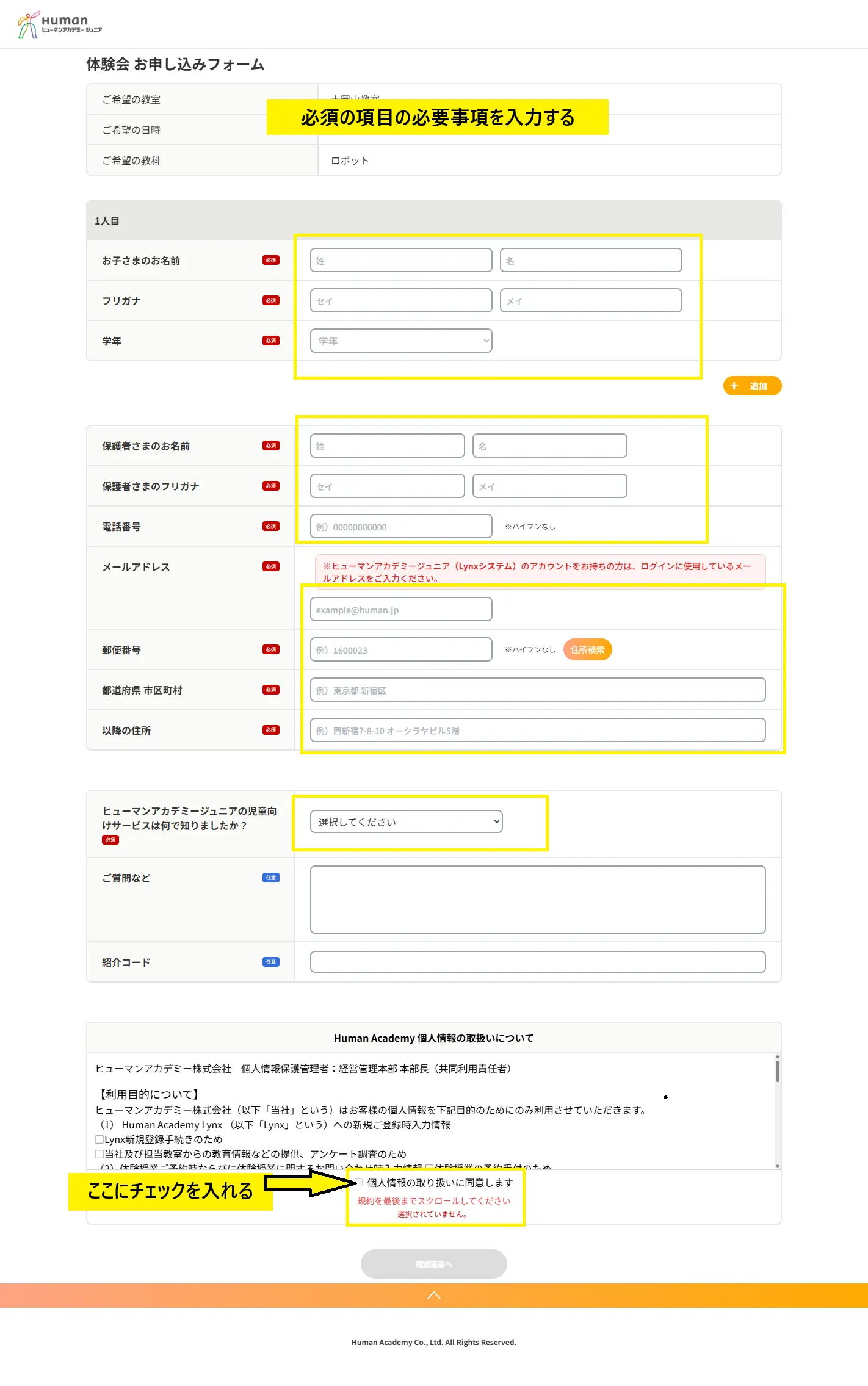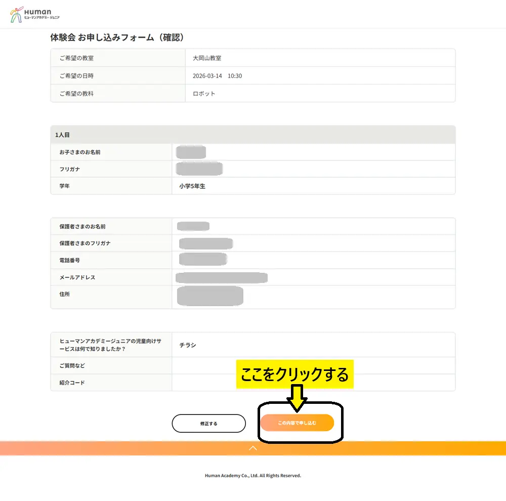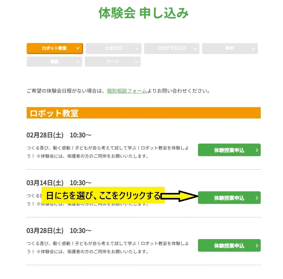 ヒューマンアカデーミーロボット教室の体験会を申し込む手順を説明します。